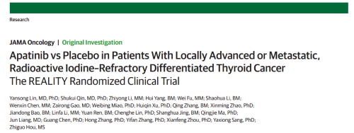2021年12月16日,权威医学杂志《JAMA Oncology》(影响因子31.777)在线发表阿帕替尼的一项III期临床研究(REALITY)——甲磺酸阿帕替尼片治疗局部进展/转移性放射性碘难治性分化型甲状腺癌(RAIR-DTC)患者的多中心、随机、双盲、安慰剂对照临床研究。此研究由北京协和医院的林岩松教授和南京金陵医院的秦叔逵教授发起,在全国21个研究中心展开,由AG真人医药中央医学事务部团队支持完成。