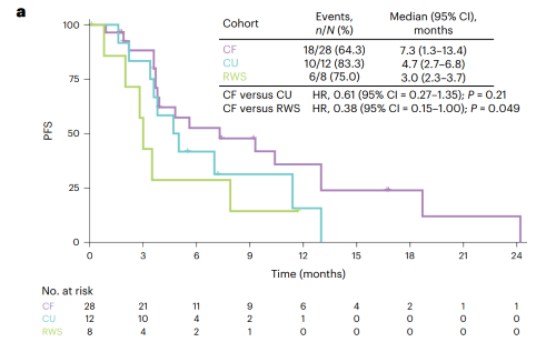 RWS队列(n=8)中位随访时间12.2个月,8例患者接受一线抗肿瘤治疗(化疗,n=2;免疫治疗,n=4;靶向治疗,n=2),均未达到完全和部分缓解,DCR为75.0%,中位PFS为3.0个月(图3a),中位OS为12.2个月(图3b)。